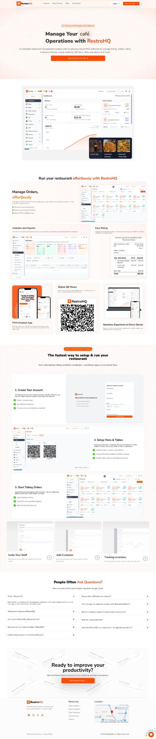Impact: The homepage effectively showcases RestroHQ’s capabilities, providing potential clients and users with a clear understanding of the platform’s benefits. It demonstrates a professional, functional, and modern interface, reflecting the quality and efficiency of the platform itself.